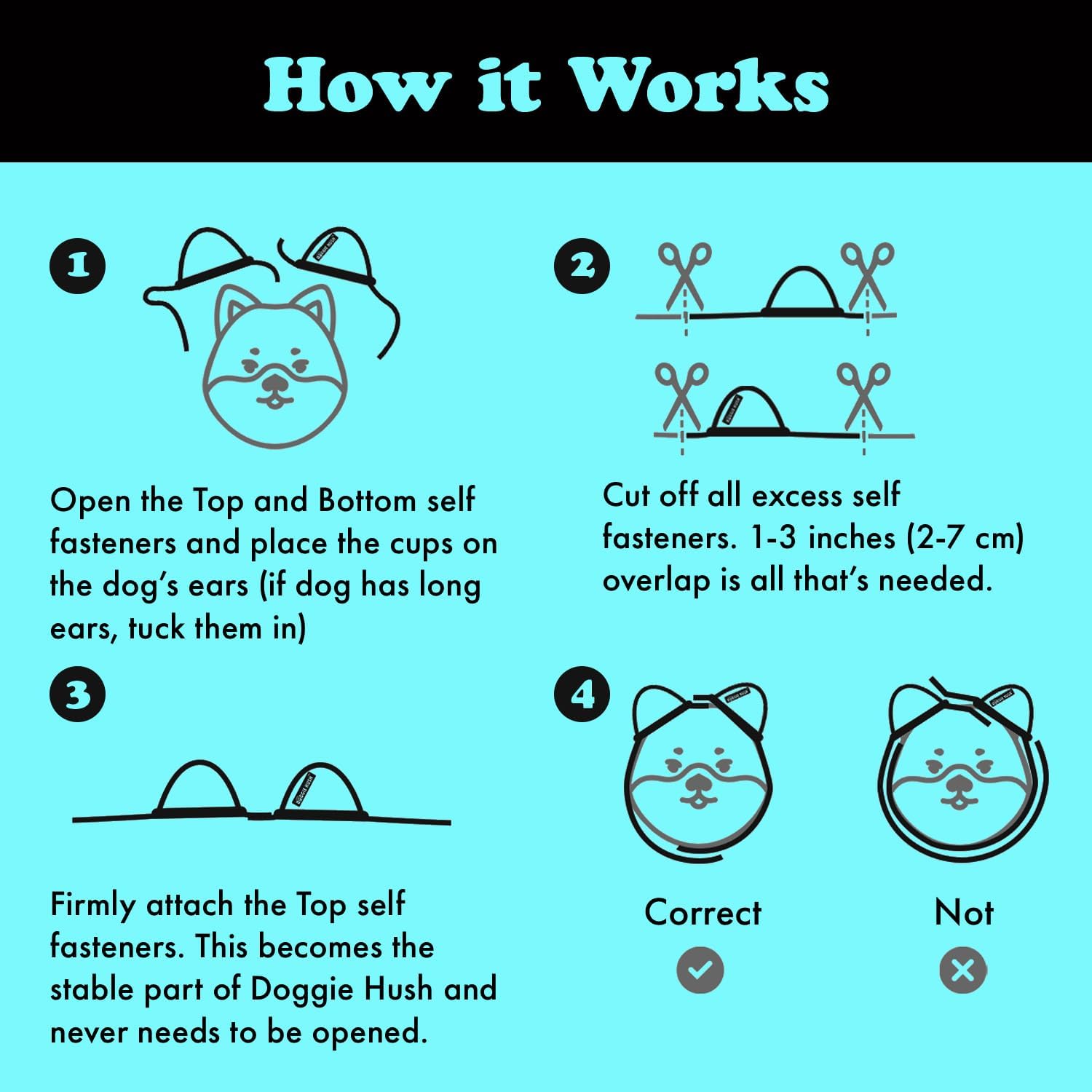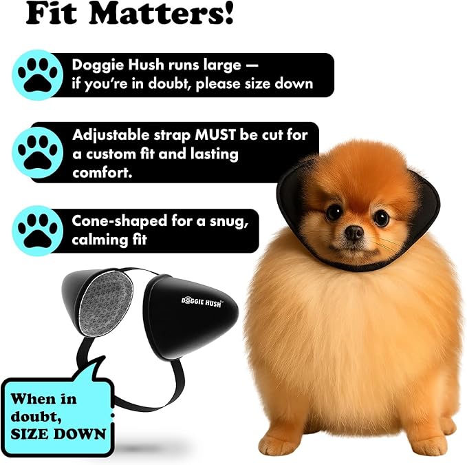 • FIT MATTERS, AND IT’S EASY: Check the visual sizing chart and simple step-by-step guide in the images. Doggie Hush runs large - if your dog is between sizes, we recommend sizing down. The fastening straps must be cut to ensure a customized and secure fit