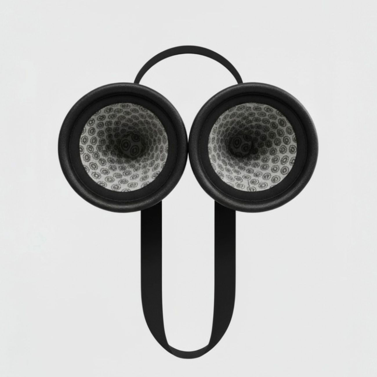 Dog ear protection device with black cups and head strap on white background.